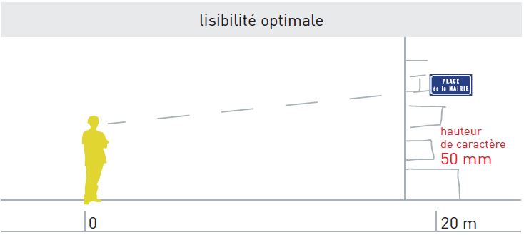 - un caractère clair sur fond foncé à une distance de lisibilité de 400 fois sa taille (ex : 20 m pour une HC de 50 mm).